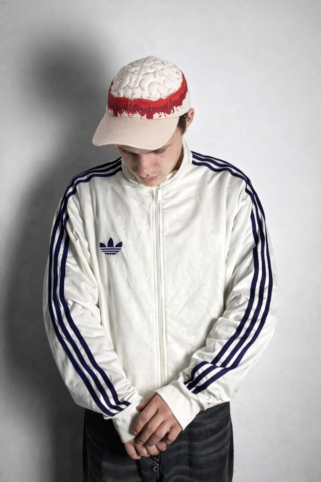 The Brain Leak Cap features a raised brain texture on the crown, surrounded by a red drip graphic that circles the entire cap.