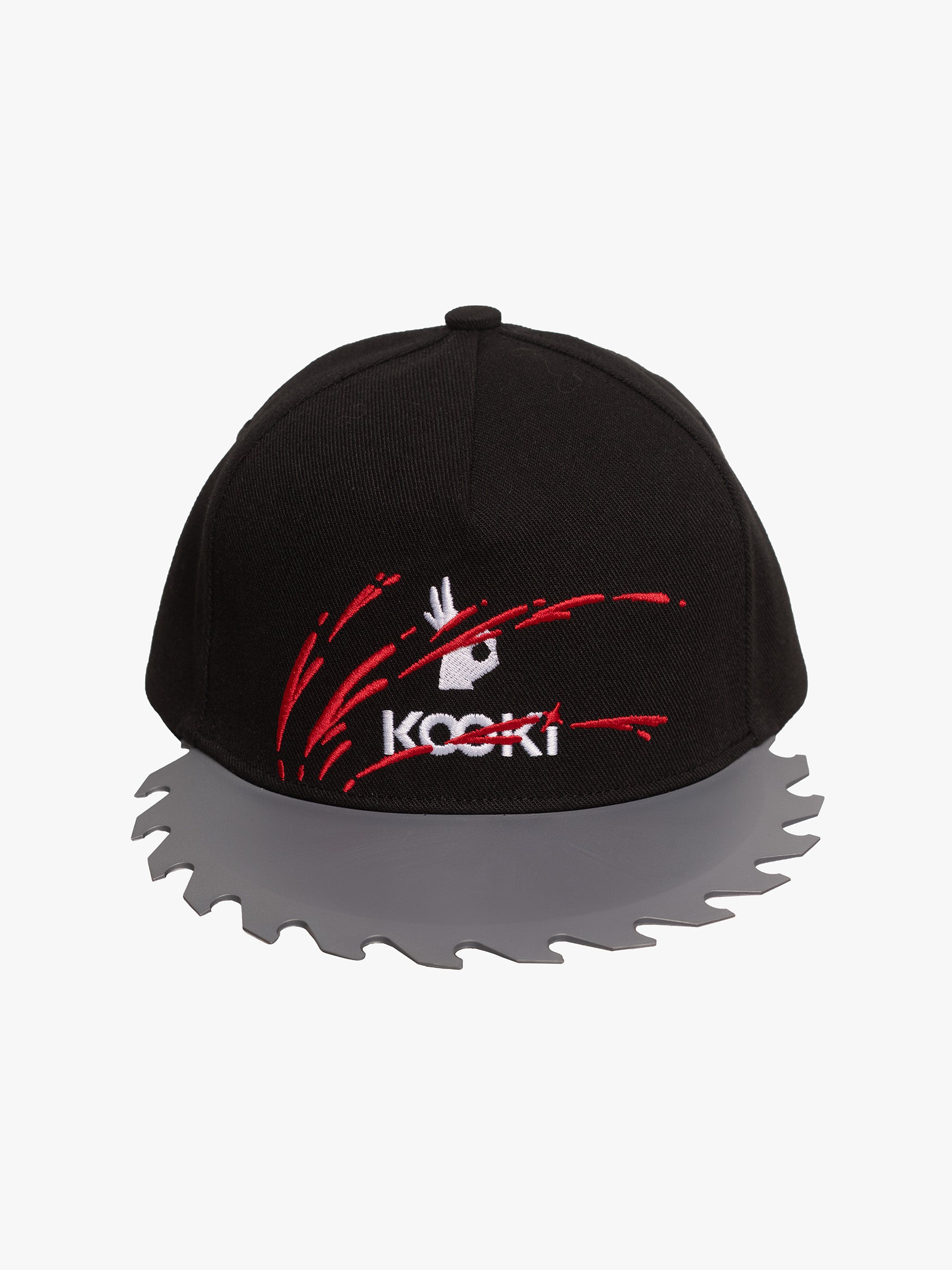 The brim is shaped like a circular saw blade, made from molded rigid TPU, paired with a structured cotton crown embroidered with KOOKi’s signature splatter stroke (is that ink? paint? blood? you decide).